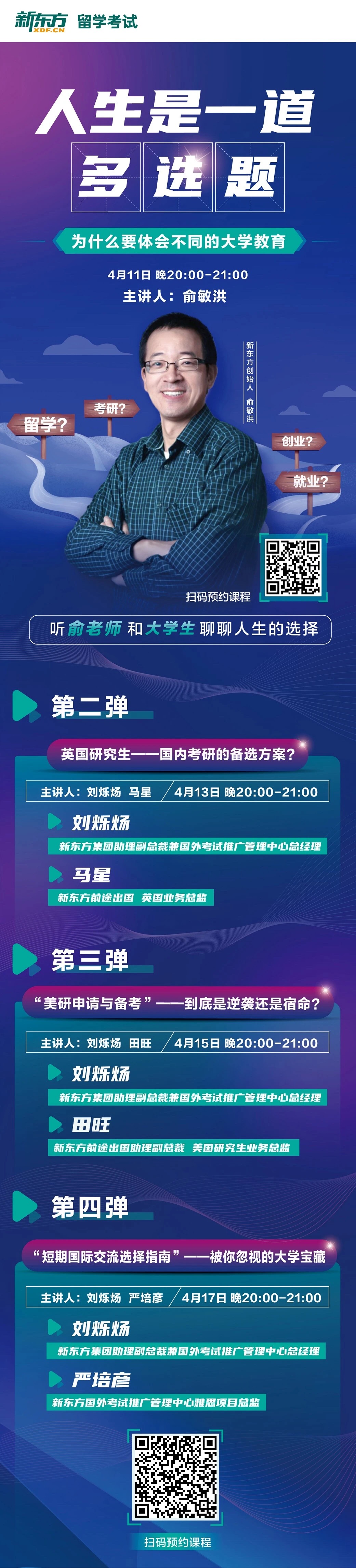 为了帮助大家更好的做出选择,小新为大家准备了一系列的直播课程#人生是一道多选题#。4月11日、13日、15日、17日晚,由俞敏洪老师带队,老炮开腔,大咖云集,跟你聊聊为什么要体会不同的大学教育。