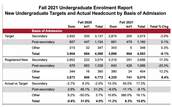 看完全校的学生数,再来看一下21秋入学的新生人数,可以看到学校招生目标为4582人,最终实际入读为5076人,超指标人数10.8%,而20秋的实际入读4772人,比目标招生数多4%,可见21秋扩招的效果还是非常明显,21秋中扩招最大的是从20秋的转学生变成了今年的新生。这个和BC省的学院大学转学协议有关。而高中直录入学的国际生只有291人,而转学进来的国际生有426,也提醒想进SFU的国际生,转学进入SFU也是一个不错的途径。