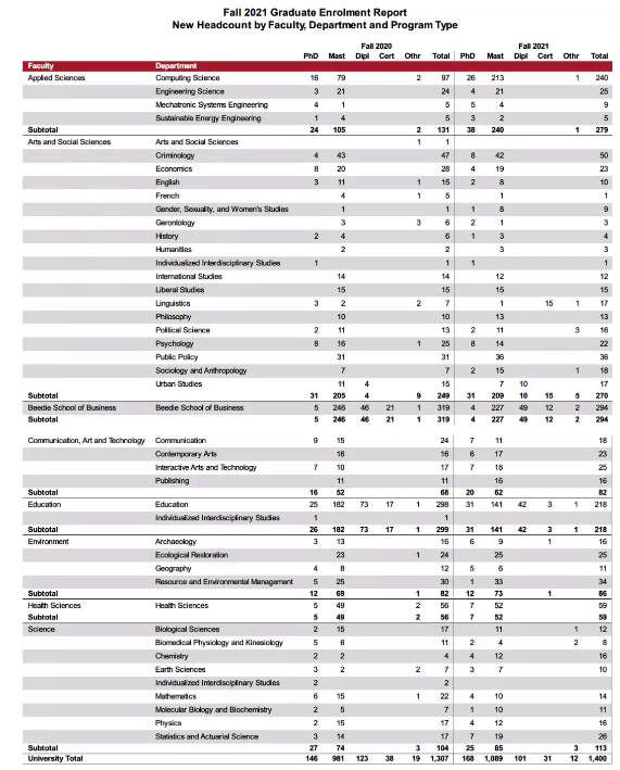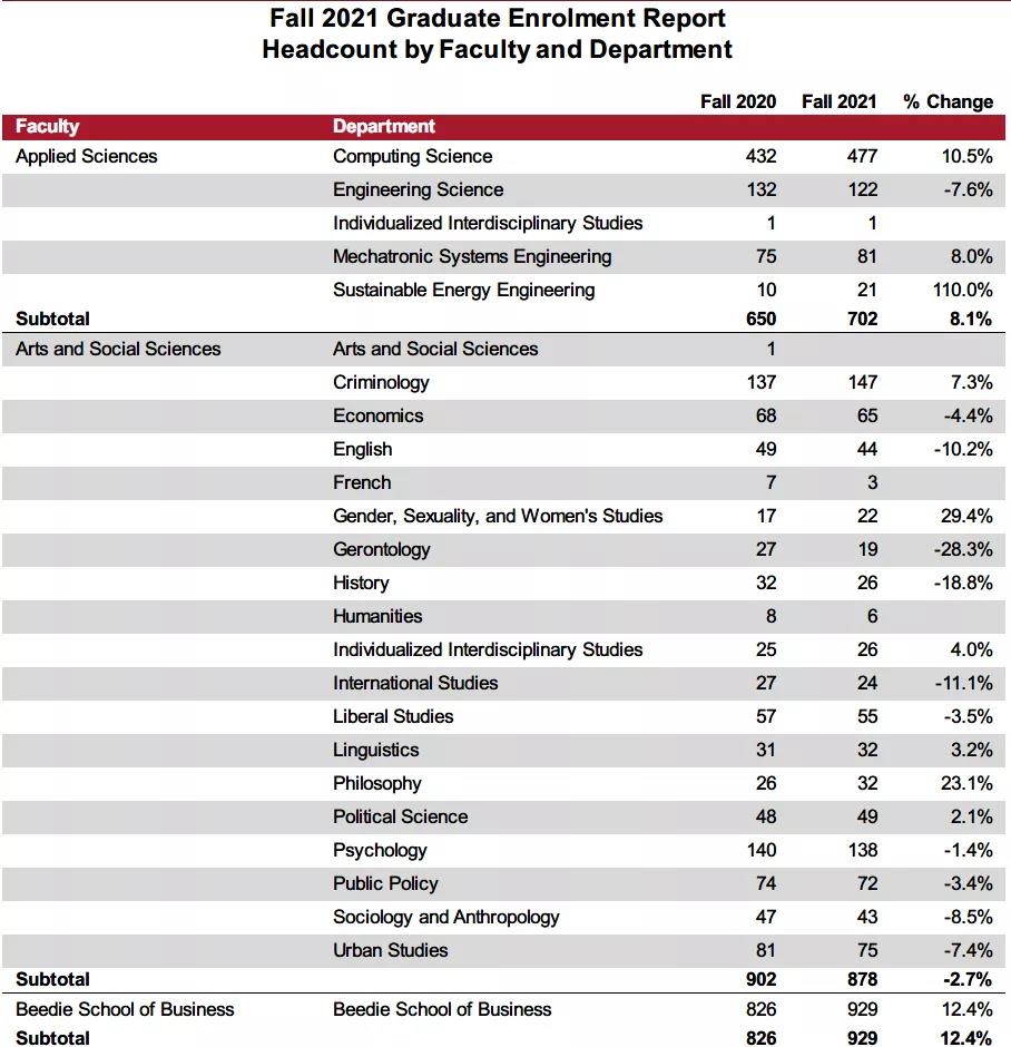 研究生部分,SFU的整体人数21秋较20秋增加15人,小编认为这属于正常的变动范围。其中最热门的计算机科学,21秋在校人数比20秋增加了45人。研究生专业招生最大的则是商学院,达到929人。而在20秋招生最多的还是教育学。
