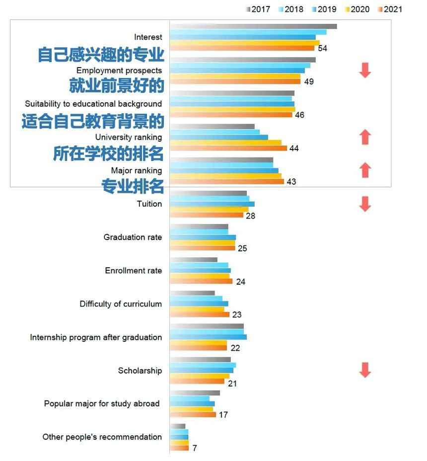 参考《新东方2021留学白皮书》数据,意向留学人群在进行专业选择时的考虑因素趋于:挖掘兴趣早规划、职业导向、合理选择。
