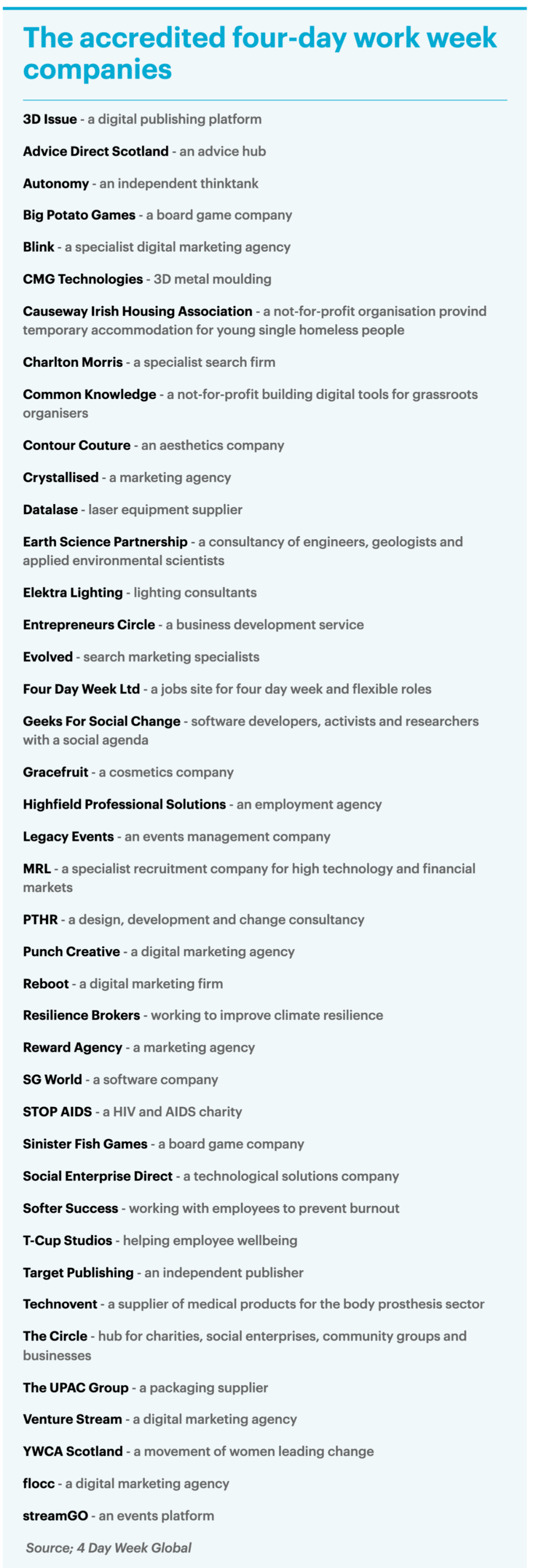 该项目是与智库Autonomy、牛津大学、波士顿学院和剑桥大学的研究人员合作开展的「一周工作4天」,这周开始有30家英国公司加入了这个实验项目,一共会试验6个月。参与该试点的公司的员工预计将在2022 年6月至2022年12月每周减少一天的工作时间,不过他们预期能保持100%的生产力,同时,他们的工资也会保持不变。主要的优点有两个,一是能提高员工的生产力,创造出更高的绩效和利润;二是能吸引和留住更多有才能的员工。亨利商学院的一项研究发现,参加「一周工作4天」的250家公司每年可节省约920亿英镑,因为他们的员工更快乐、压力更小、病假时间更少。总结来说,就是休息好的员工就是更有创造力&生产力的员工。