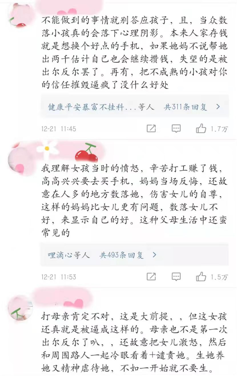 大部分网友也表示理解女孩当时的愤怒,毕竟妈妈让人憎恶的不仅是出尔反尔,更是不顾女儿的感受和尊严,故意把女儿置于舆论的漩涡之中。