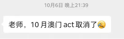 然而,10月8日的ACT就在眼前,10月6日晚上9点39分,我收到X同学的微信:10月澳门ACT考试取消了……