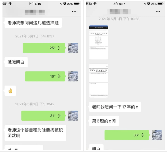 在4次课之后,我开始带他成套刷BC练习题,按照考试时间要求,完成了5套题。每次答疑后,他也积极整理错题,同类型习题基本不会再错,错题数量越来越少。其中有一套题是在考前1天完成的,5月3号晚上10点多还在复习题目,找老师答疑。从整套题目连问10多道题,到最终自己想不明白的只有最后一道大题的最后一小问。