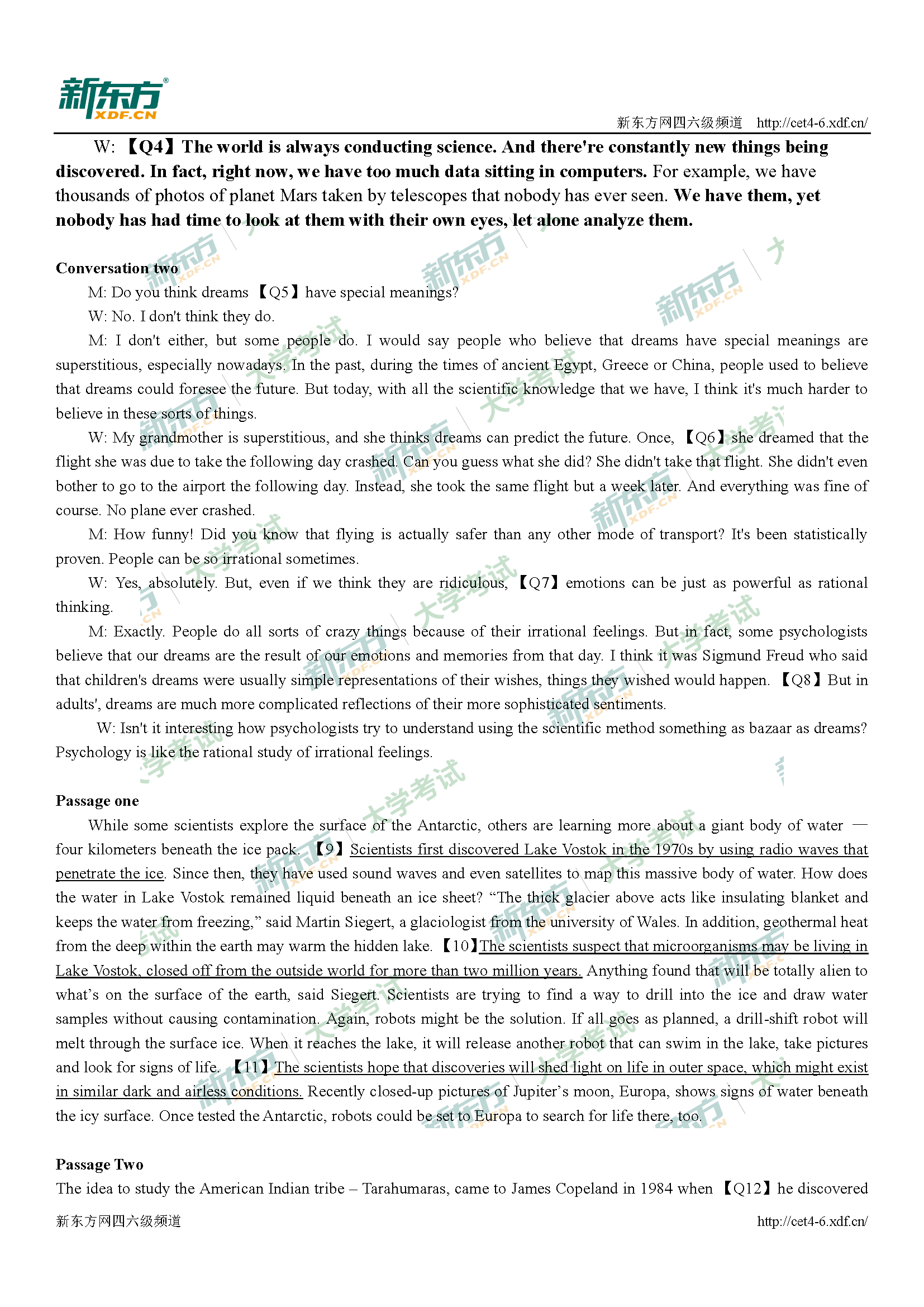 以下内容是2020年9月大学英语六级听力真题及答案,供各位考生参考!新东方网四六级频道第一时间更新公布英语四六级真题答案。同时广大考生还可随时@新东方网四六级微博,与线上老师以及考生随时互动答疑,敬请广大考生密切关注2020年9月英语四六级真题解析专题。