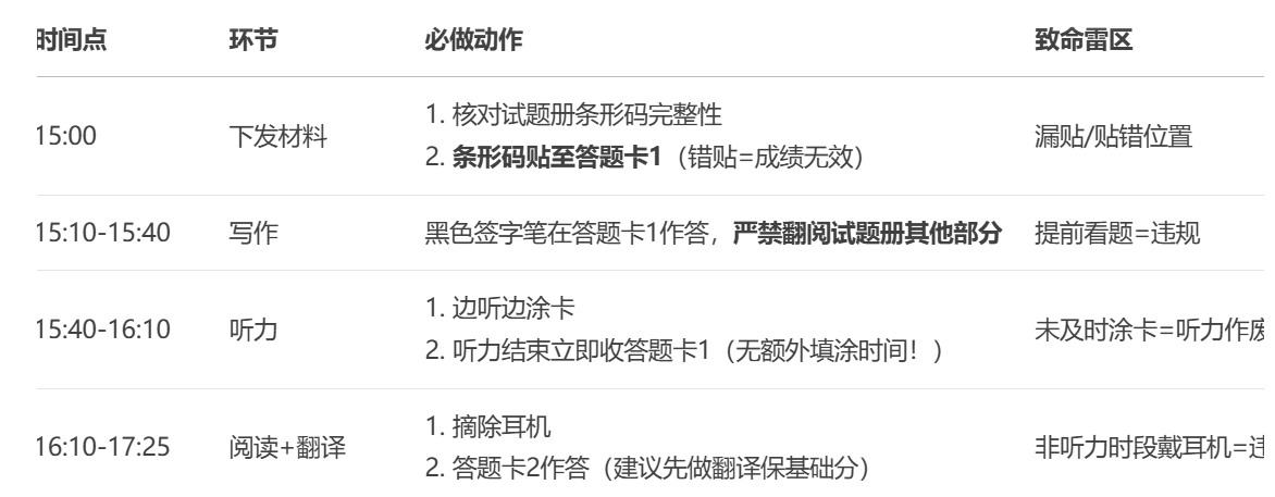 六级考试倒计时!必带三证缺一不可,15:00后禁入场;听力边听边涂卡,收卷无补涂机会;阅读定位关键词,翻译拆分复杂句。严守考场规则,备好应急方案,稳住心态全力冲刺!