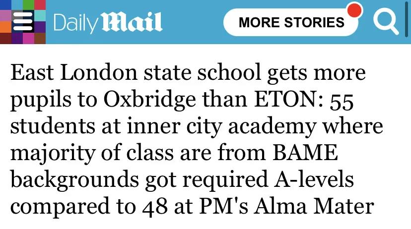 但是今年,一所来自东伦敦的“贫民窟”公立学校闯入了大家的视野——它竟然成功将55名学生送进牛剑,不仅创下了自身的新纪录,也超越了伊顿公学48名学生的成绩!