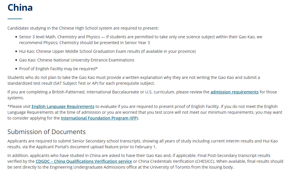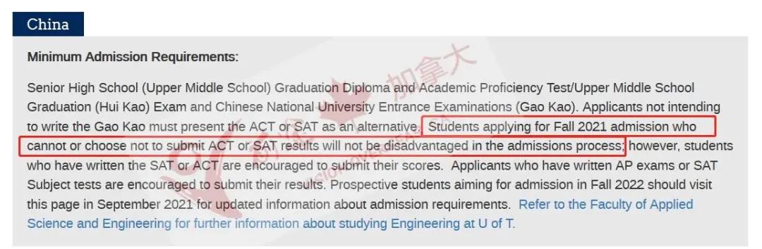 中国普高的学生申请多伦多大学,如果不参加高考,必须提交ACT或SAT成绩作为替代。这部分学生在2021年秋季入学的申请中如果没有参加或者选择不提交SAT和ACT成绩,在录取审理中不会受到劣势对待(工程学院除外)。已经参加了SAT或ACT以及AP或SAT科目考试的学生被鼓励提交这些成绩(2022年秋季入学的政策会在2021年9月更新,请随时访问参考)。