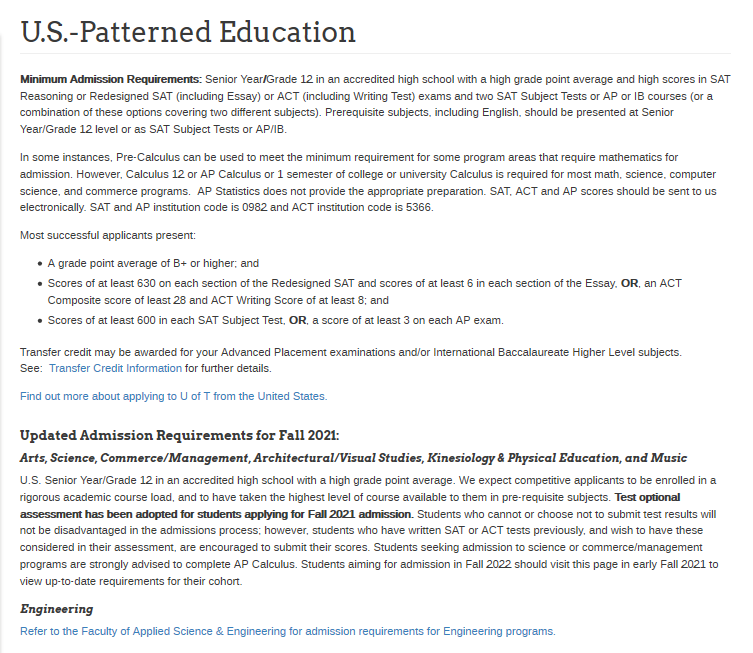 6.针对2021年秋季入学的申请,学生如果没有参加或者选择不提交SAT和ACT成绩,在录取审理中不会受到劣势对待。然而,此前已经参加了SAT或者ACT考试的学生并且希望将此成绩用于审理中,多伦多大学鼓励这些学生提交他们的成绩。强烈建议申请理科、商科/管理学专业的学生完成AP Calculus考试。此政策适用于:Arts、Science、Commerce / Management、Architectural / Visual Studies、Kinesiology & Physical Education and Music。工程学院不适用此政策!!!