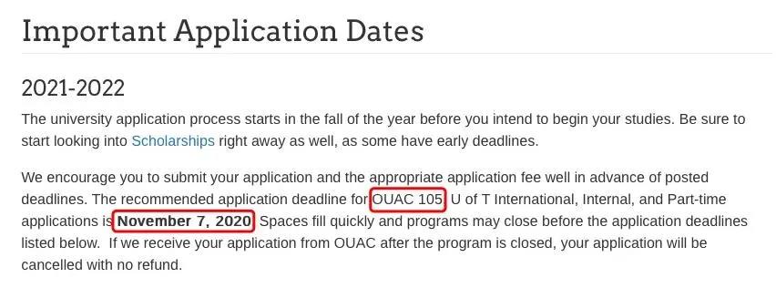 多伦多大学2021-2022学年的申请预计9月-10月开放,通过OUAC105通道申请的学生,多伦多大学依然建议学生在2020年11月7日之前提交申请,名满为止;OUAC101通道的学生,申请截止日期为1月15日。