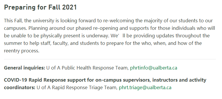我们写信确认麦吉尔将于2021年秋季开始亲自授课。虽然课程的某些部分将利用在线教学的教学优势,但学生和教师应该计划在9月前回归更有规律的校园学术活动。考虑到这一点,学生宿舍将于2021年秋季开放,通常保证向所有申请住宿的符合条件的一年级学生提供住宿。同样,我们将继续制定计划,逐步恢复行政和支持人员的校园工作,目标是到2021年9月实现定期工作。我们将继续采取一切必要的健康和安全措施,以确保校园在未来一年仍然是学习和工作的安全场所。而公共卫生的发展情况在魁北克无法确知的,我们有信心在我们的集体能力提供学术项目和大学服务的方式满足麦吉尔大学的卓越标准预期同时继续确保我们的社区的安全。我们感谢您在未来几周和几个月有任何问题,我们承诺定期提供最新信息,为重返校园活动做准备。