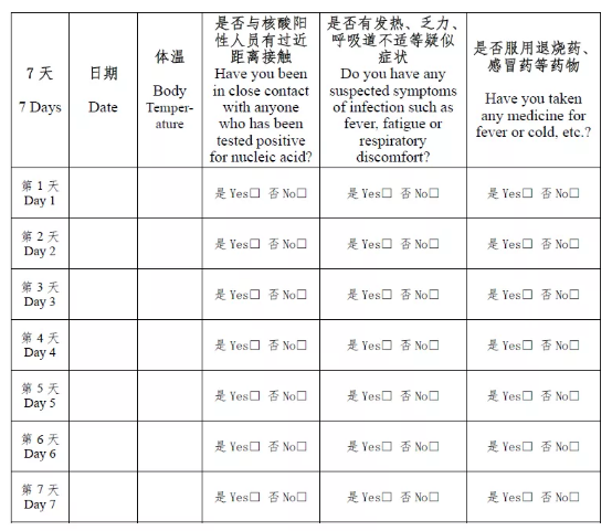 表格需要回国旅客每天填写体温和回答是否有新冠的相关症状等问题。