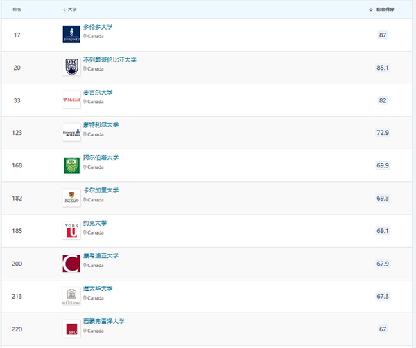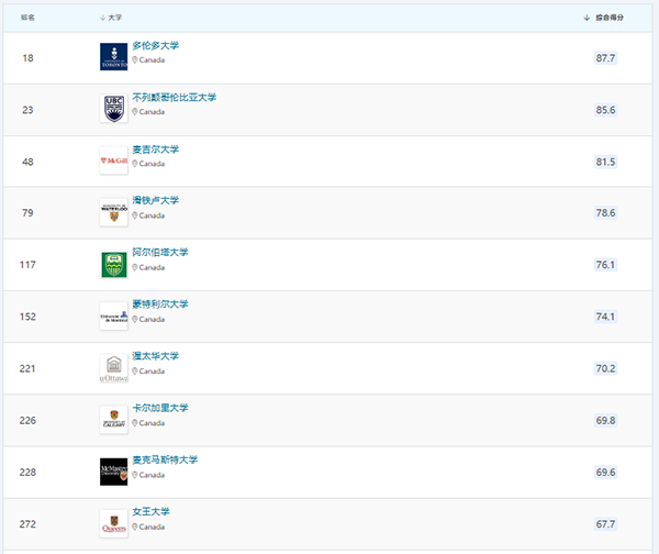 在细分的51个学科中加拿大大学位于世界大学排名前10的有: