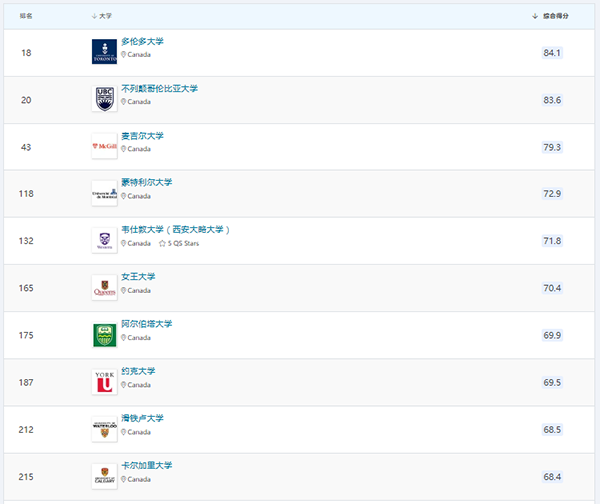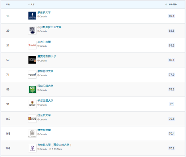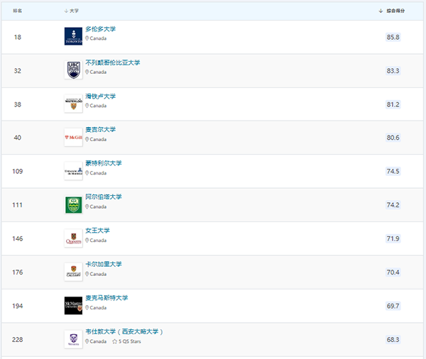 除此之外,在艺术与人文、工程与技术、自然科学、社会科学与管理、生命科学与医学五个领域,加拿大部分大学的排名情况如下。
