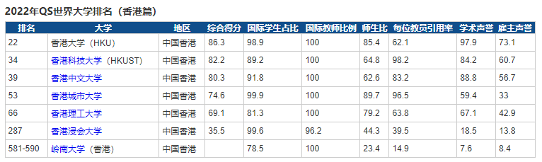 其中,香港大学的排名保持不变,香港科技大学下降7名,香港中文大学前进了4名,香港城市大学下降了5名,香港理工大学前进了9,香港浸会大学下降了23名,岭南大学基本保持不变。