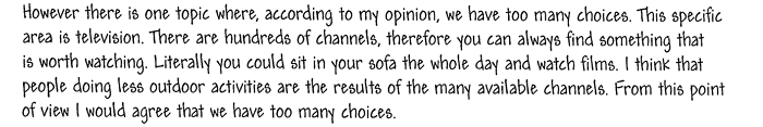 然而,有一个话题根据我的个人看法确实给我们的选择太多了。这个领域就是电视频道。有上百个电视频道,我们完全可以坐在沙发上看一整天的电影。我认为这也是为什么现在人越来越少的去做户外活动,因为节目太丰富。从这个角度来说,我觉得我们被给予的选择太多了。