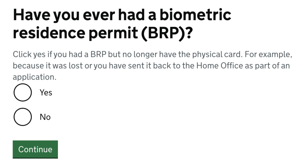 若持有BRP卡选择“Yes”,并输入卡号;无卡选“No”。