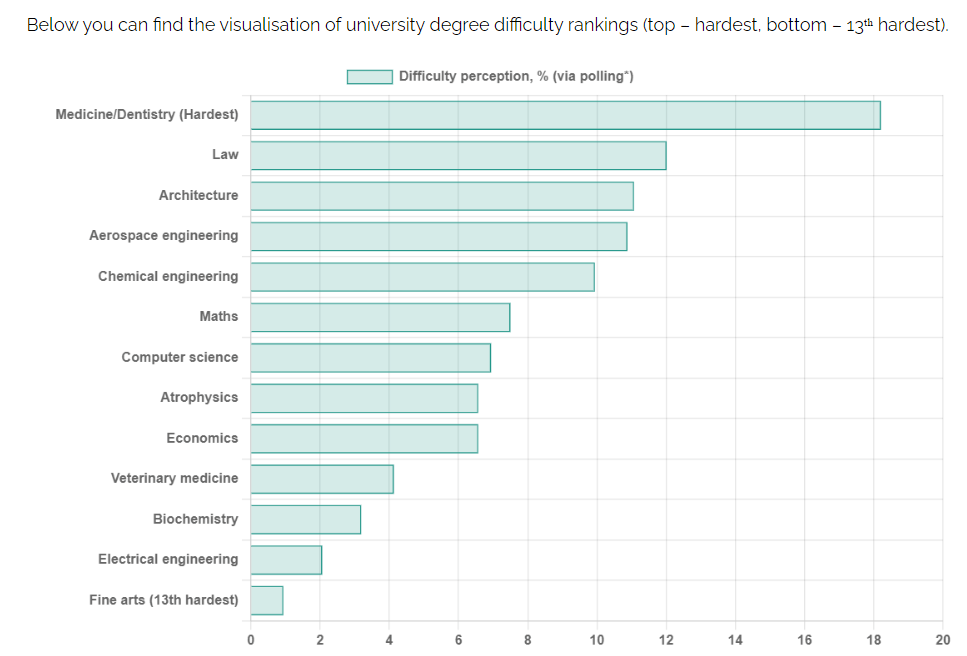 本次排名对难度的评估是基于学生调查的意见组成的。尽管大家在选择专业时可以考虑以下排名,但最主要的还是要依据你具体的能力及兴趣。
