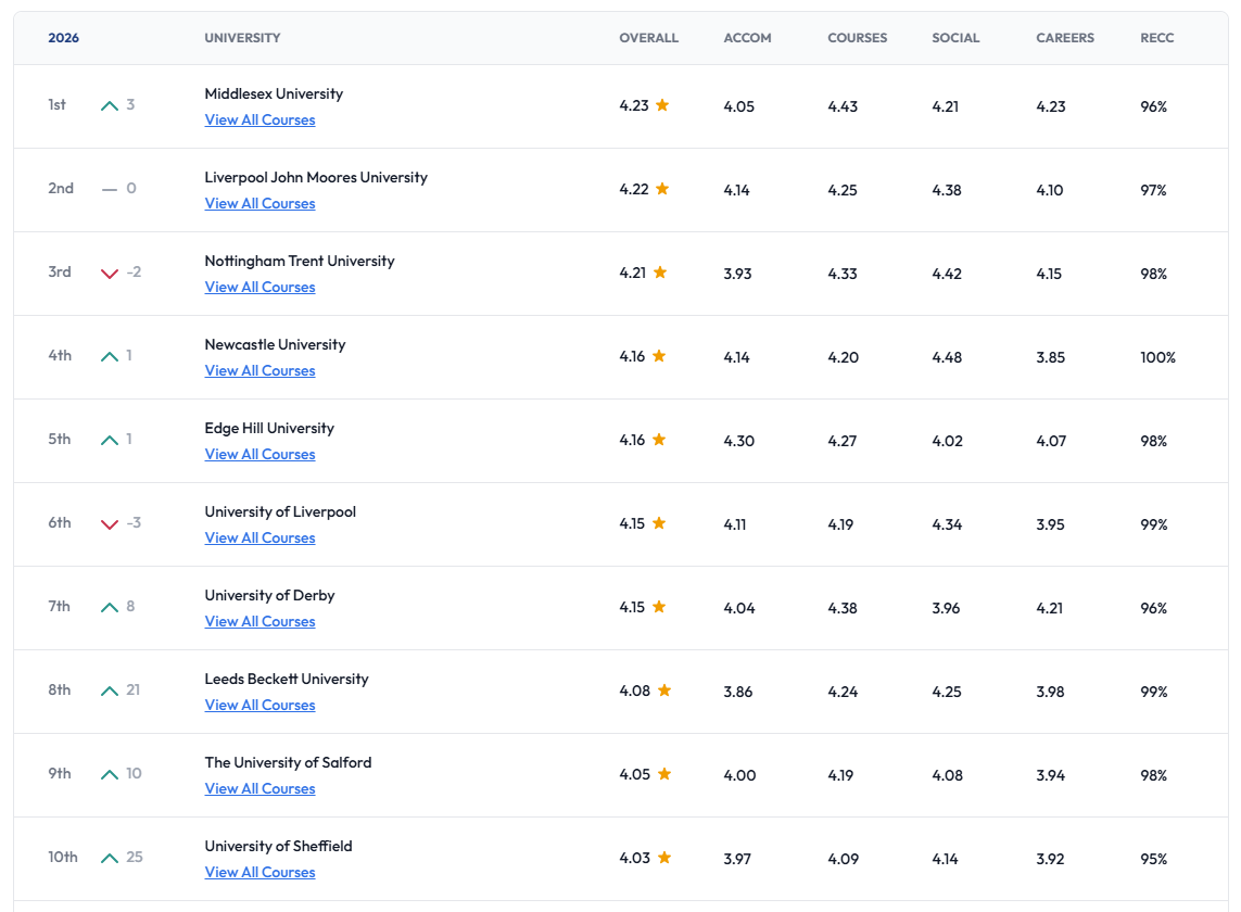 在这份榜单中,排在前五名的大学包括:密德塞克斯大学、利物浦约翰摩尔斯大学、诺丁汉特伦特大学、纽卡斯尔大学、知山大学。
