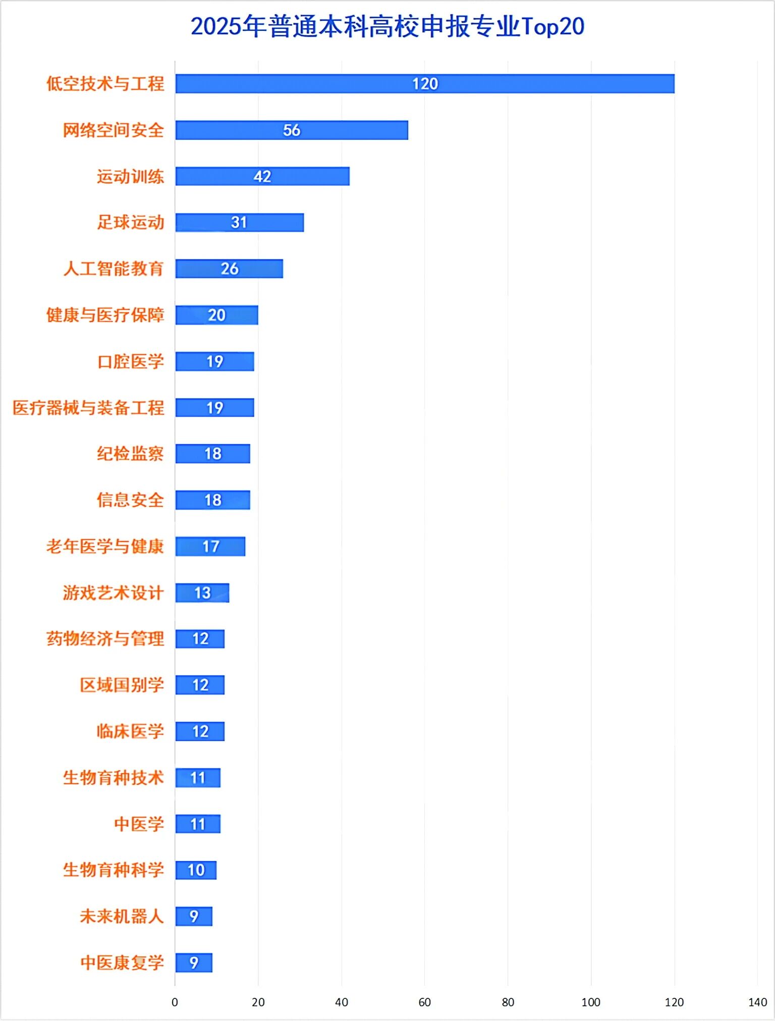 申报数量前五的专业为:低空技术与工程(120所)、网络空间安全(56所)、运动训练(42所)、足球运动(31所)、人工智能教育(26所)。