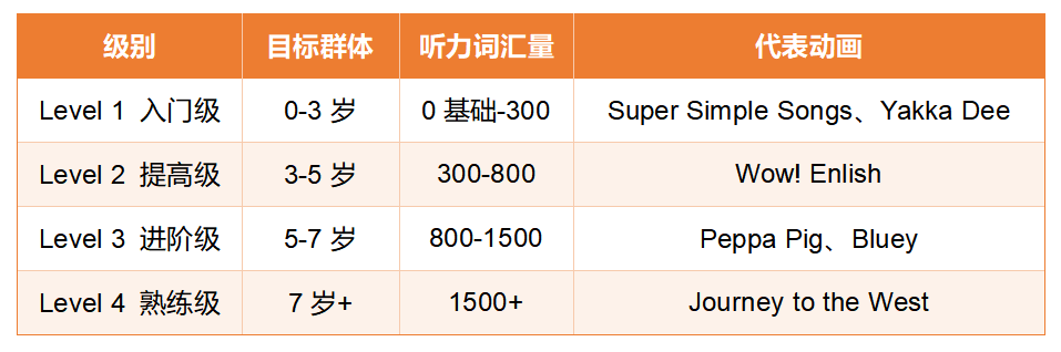 该体系综合考量了孩子的认知发展规律、动画的语言难度以及教学实践经验,将热门动画科学划分为4个级别。