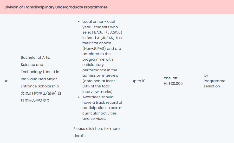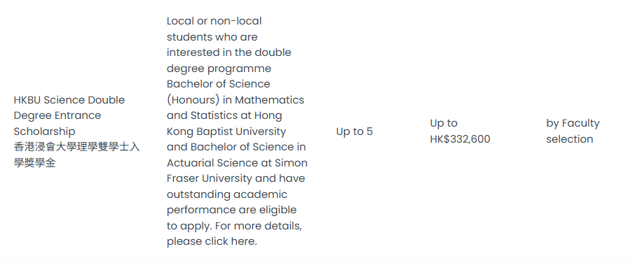 全额学费及津贴,此奖学金择优录取,主要面向被香港大学本科生课程或香港大学合作项目录取的杰出新生。无需申请。符合条件的学生将被自动考虑。