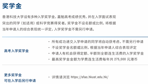 高考生以高考及面试成绩为基础(不设面试的专业则按高考成绩为基础),各学院内综合表现最优秀且英语分数达120分的学生或可获颁发奖学金,大学将于发出录取时一并通知奖学金详情,同学毋须另行申请。