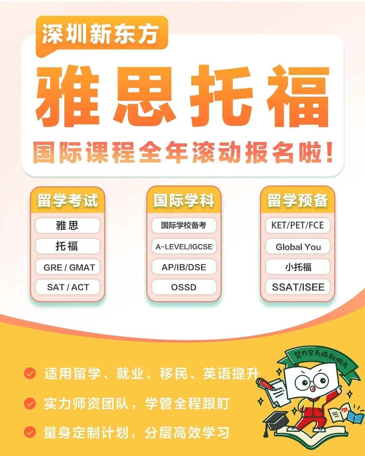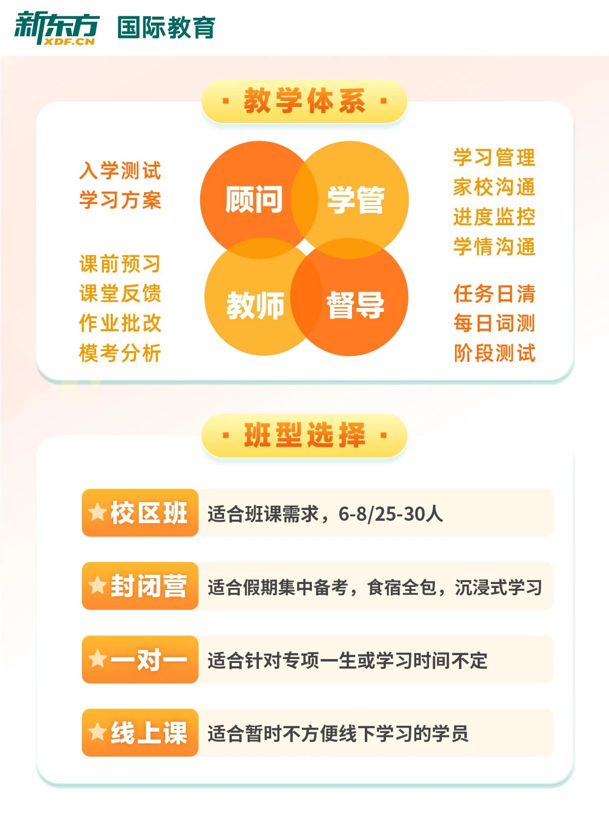 针对不同留学需求,提供多种有针对性的课程服务。 留学考试类有雅思、托福、GRE、GMAT、SAT、ACT;国际学科类有国际学校备考、AP、A-Level、IB、IGCSE、DSE、OSSD;留学预备类有小托福、KET、PET、FCE、Power up、UNLOCK、自然拼读。