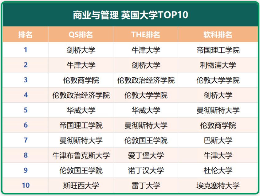 今天小微就结合最新QS、THE、软科三大世界学科排名,为大家整理出各个商科英国大学Top10名单: