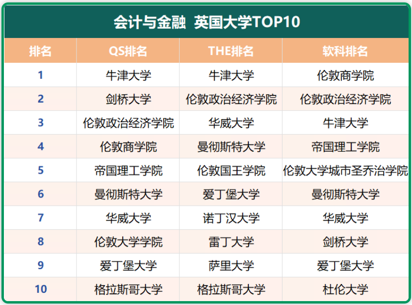分别在三大排名的“会计与金融”学科中,位列前10的英国大学有: