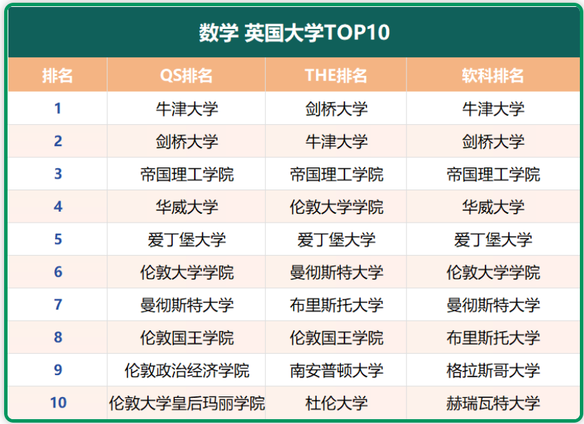 分别在三大排名的“数学”学科中,位列前10的英国大学有: