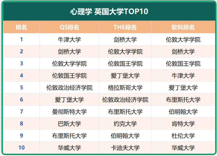 分别在三大排名的“心理学”学科中,位列前10的英国大学有: