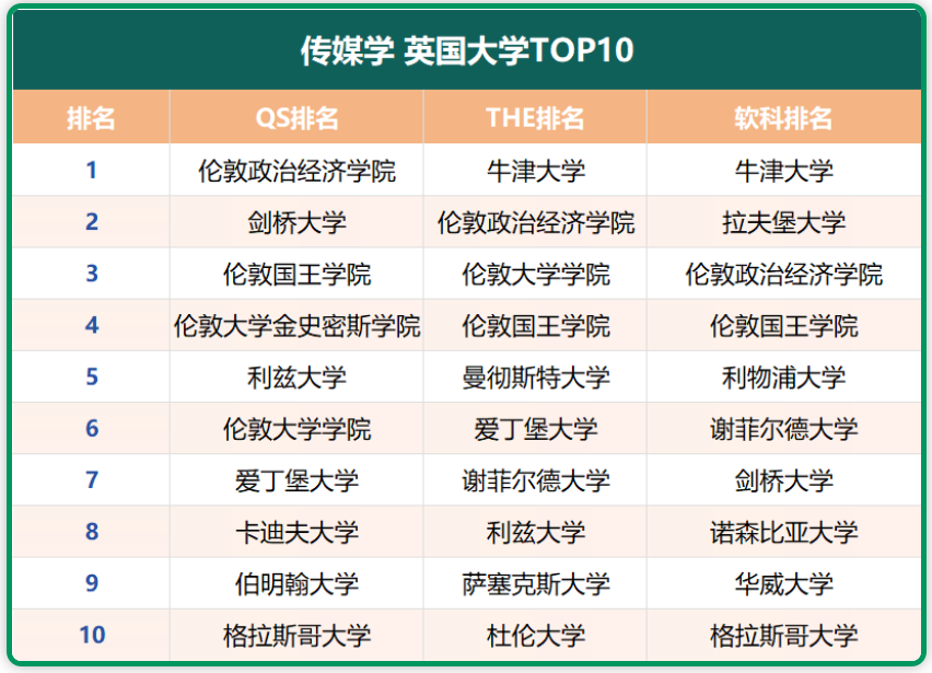 分别在三大排名的“传媒学”学科中,位列前10的英国大学有: