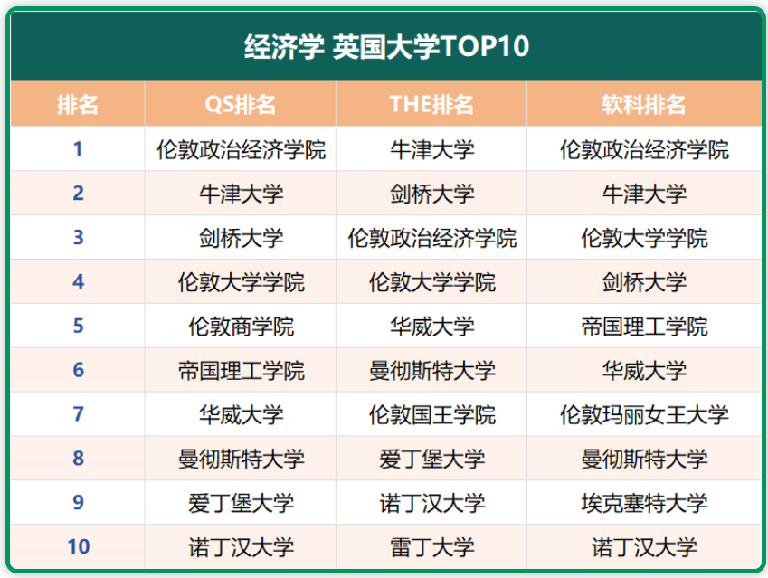 分别在三大排名的“经济学”学科中,位列前10的英国大学有: