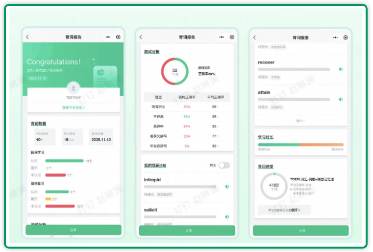 从第二天开始,小程序也会根据“艾宾浩斯遗忘曲线”和你的词测记录来推送每日复习词。背诵过程中建议搭配纸质笔记本,把容易混淆的词和固定搭配整理下来。比如“adapt ”、“adopt”这类发音和拼写相近的词,放在一起对比记忆更高效。