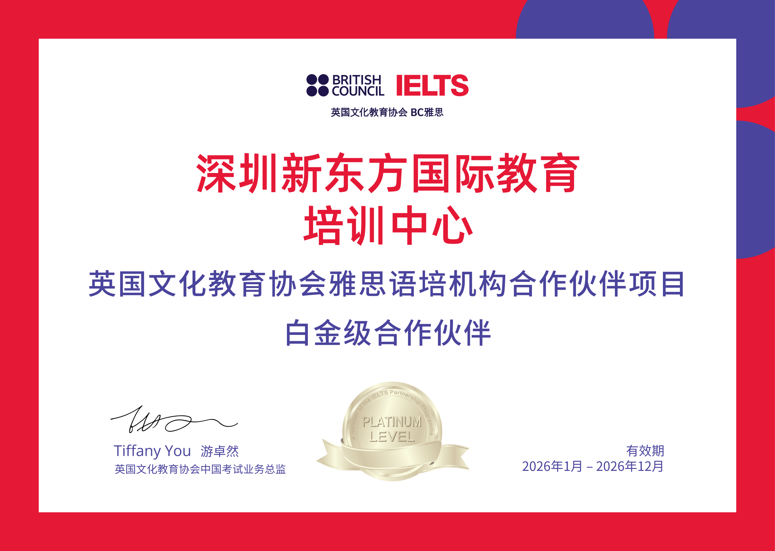 深圳新东方国际教育培训中心荣获“白金级合作伙伴”称号。