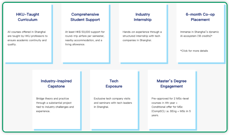 项目还包含为期六个月的带薪实习(Co-op),学生将有机会深入上海充满活力的人工智能与科技生态圈,接触领先的研发活动,并在上海知名的科技公司参与实习。