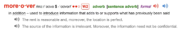 还有一类就是像“moreover”这种用来衔接的单词,大家在雅思作文中可能会经常使用这个词,其实它在英英词典中显示的是“formal(正式)”用词,所以并不建议大家在口语中使用。