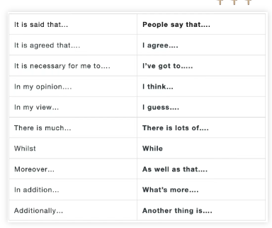 而在口语使用中,推荐同学们使用“What's more”、“As well as that..."来代替它。不止这个词,还要一系列在雅思写作中好用的表达用到口语中最好都换一个说法。下面就是学姐整理出来的表格,左边的短语对于雅思口语来说太正式了,大家可以用右边的短语来代替