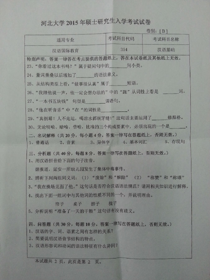 真题是考研复习中含金量最高的辅导材料,真题的利用对于提高复习效率具有至关重要的作用。一般来说,时间和精力有限,建议考生重点做近十年的真题。新东方网考研频道整理各高校历年考研真题,希望能帮大家更好的复习!下面是2015年河北大学354汉语基础考研试题。