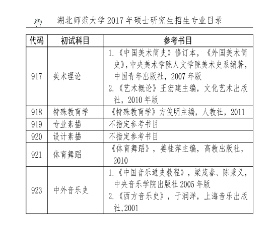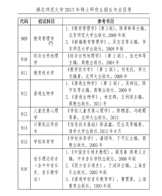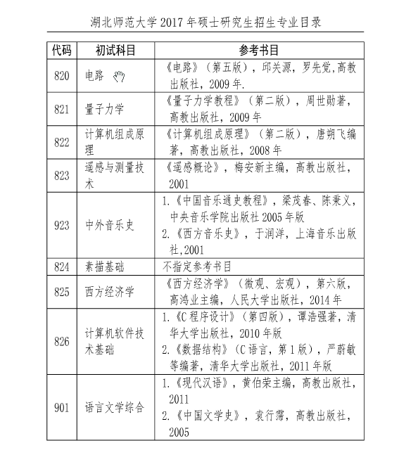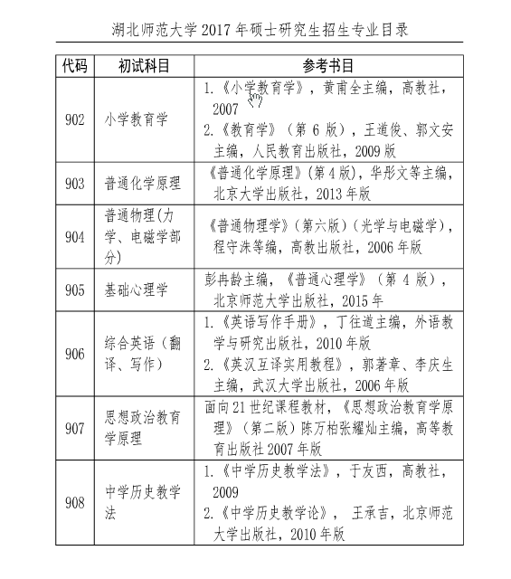 据湖北师范大学研究生院消息,2017年湖北师范大学硕士研究生考研参考书目(初试)已经公布,详情如下: