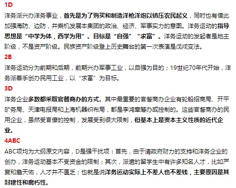 再次强调,加粗的部分重点看!洋务运动的兴起时间、目标、指导思想都需要记忆,这些在题目中也都有涉及。洋务运动中的“福州船政局”是“中国近代教育”的开端,此知识点可能作为其他题目的干扰项。此外,要注意洋务运动创办的是哪几种学堂;洋务运动的历史作用中着重考察的是其对资本主义的发展所起到的客观的促进作用。在失败原因中,封建性是指思想上的封建性,腐朽性是指地主阶级的封建衙门式的管理。并且注意:洋务运动的失败并非人才和资金的匮乏,具体解析点击阅读原文查看第四题的答案解析。