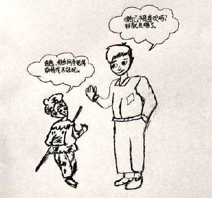 As is obviously depicted in the drawing, the son who is playing the role of Monkey King expresses his questions: why do my classmates dislike learning Chinese Opera? However, his father tenderly answers him: it will be already enough if you like it. The meaning behind the simple picture is thought-provoking.