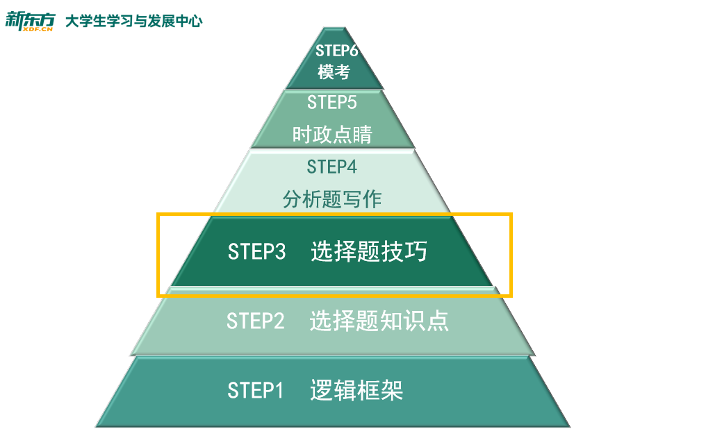 如图所示,绝大部分同学已经在暑假期间结束了五科目(马原、毛中特、习思想、史纲和思法)选择题知识点的学习,做到了理解知识点。现阶段,大家需要进阶学习选择题技巧,要求在理解的基础上背记命题规律(核心定位词、常见干扰项、各大线索梳理等),提高选择题的解题效率。