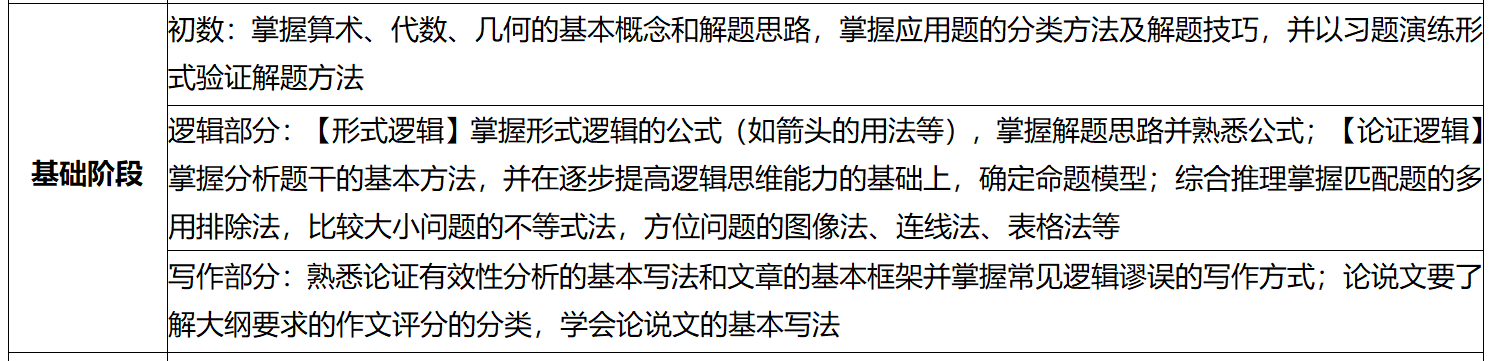 3.写作部分:在基础阶段熟悉论证有效性分析的基本写法和文章的基本框架并掌握常见逻辑谬误的写作方式;论说文要了解大纲要求的作文评分的分类,学会论说文的基本写法。