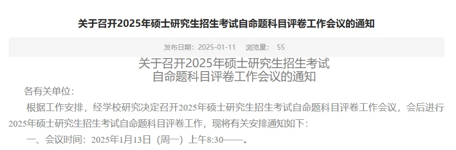 25年硕士研究生招生考试自命题科目评卷时间定于2025年1月15日-17日,每天上午8:30-下午18:00。