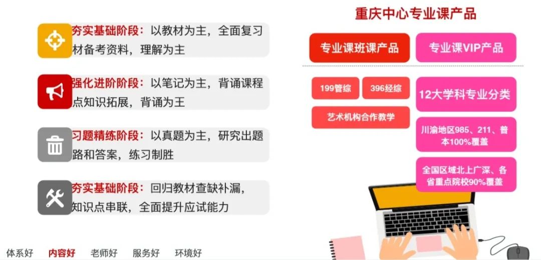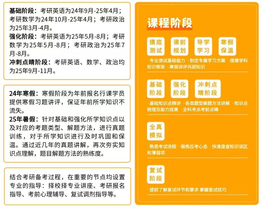 从备考、初试到复试:分为导学 | 基础 | 强化 | 冲刺阶段 | 摸底测试 | 全程督学 | 阶段测评 | 全真模拟 | 心理关怀让每一位同学都能体验到学习有规划,课程有针对,备考有体系的考研全流程服务,做到真正的无忧备考!