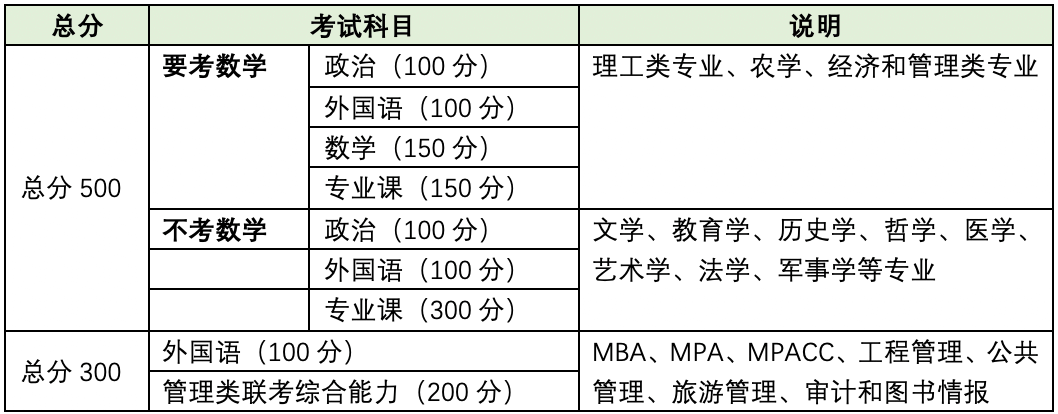 绝大多数专业,考四门:2门公共课、数学+1门专业课或者2门专业课(不考数学),满分500分