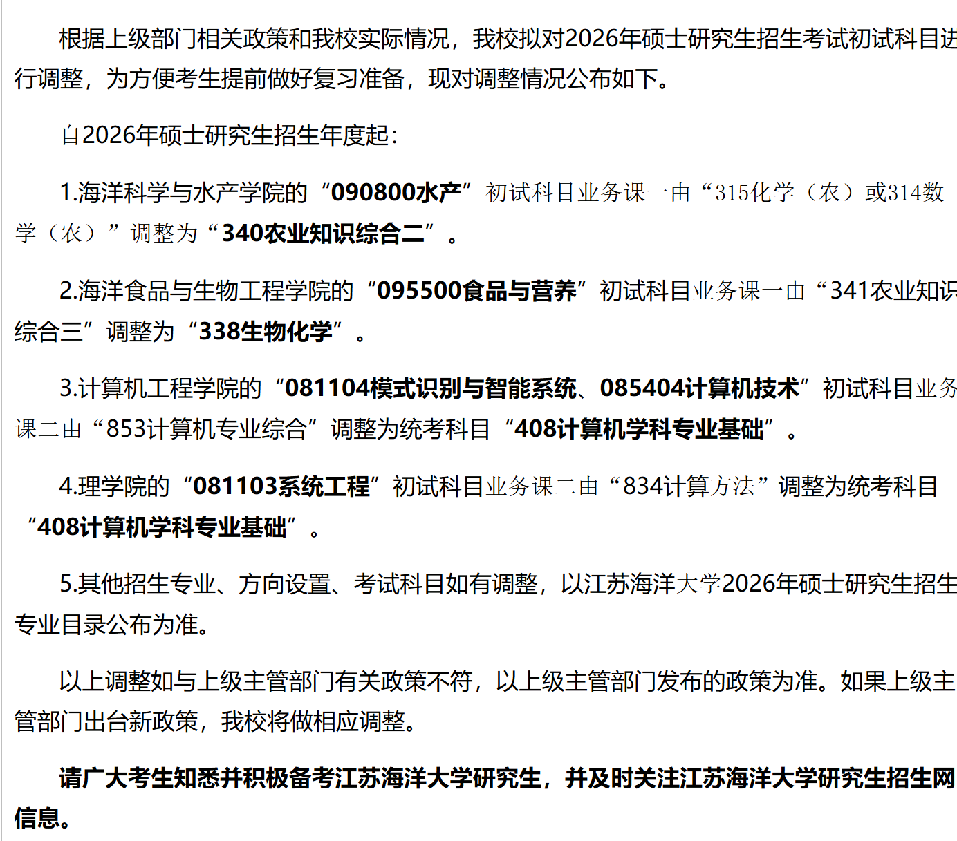 5.其他招生专业、方向设置、考试科目如有调整,以江苏海洋大学2026年硕士研究生招生专业目录公布为准。