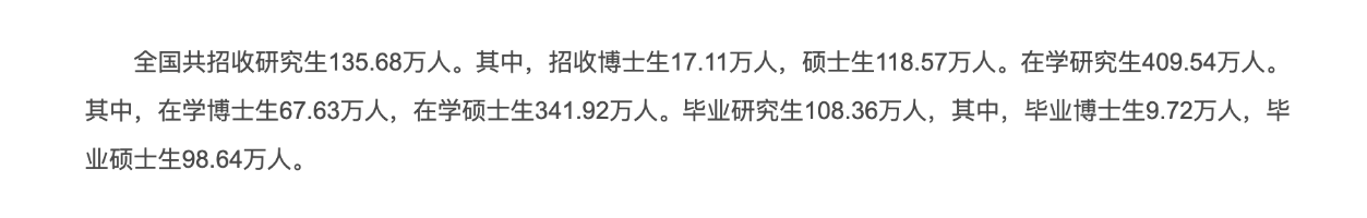 其中,研究生教育相关数据十分亮眼:2024年,全国共招收研究生135.68万人,相较去年,增长率达到了4.06%。在这庞大的招生规模中,博士生招收人数为17.11万人,硕士生则为118.57万人。